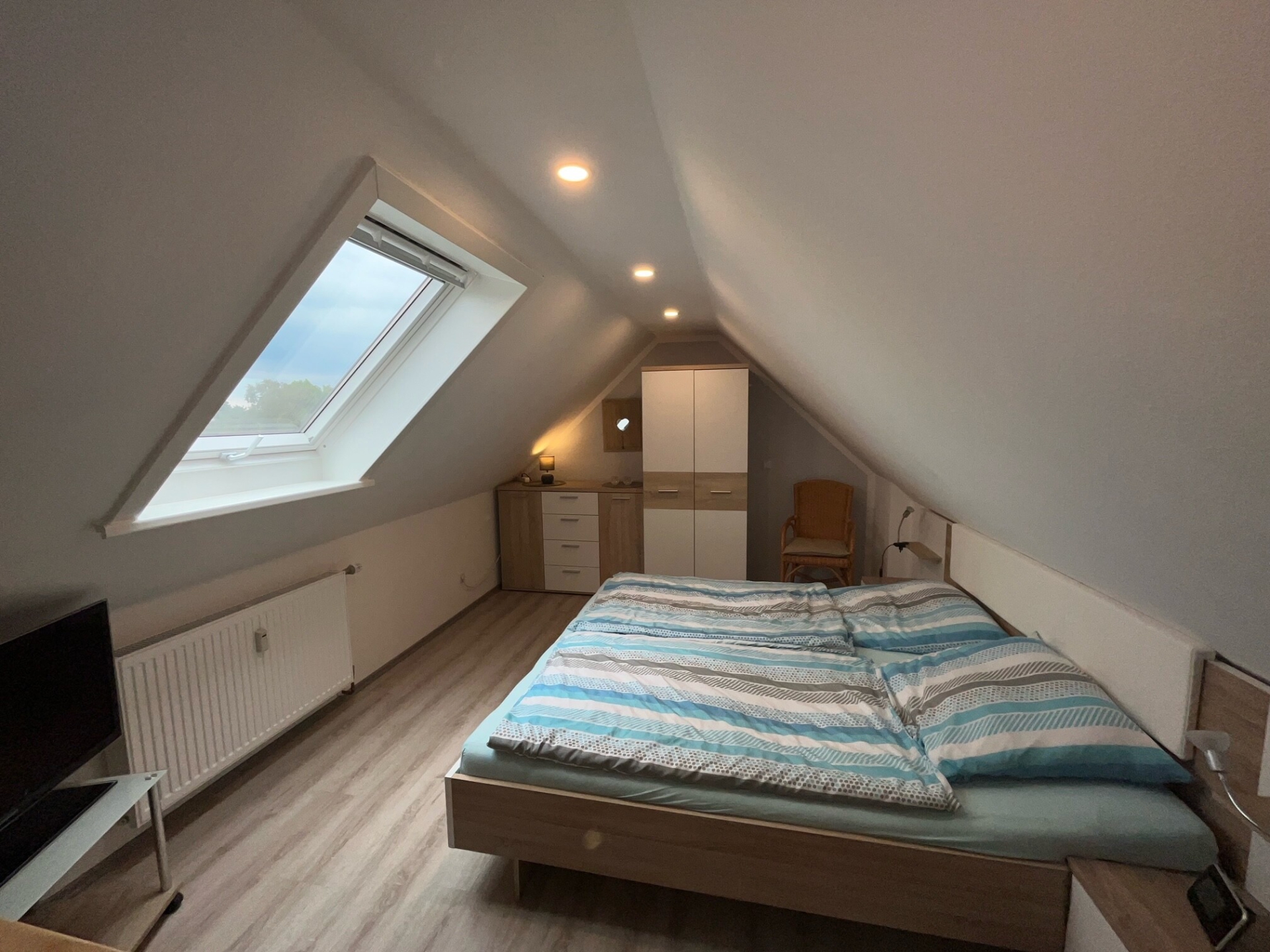 Im größeren Schlafraum, den Sie über eine Treppe erreichen, finden Sie ein Doppelbett 180 x 200 cm sowie einen großen Kabel-LED-TV.