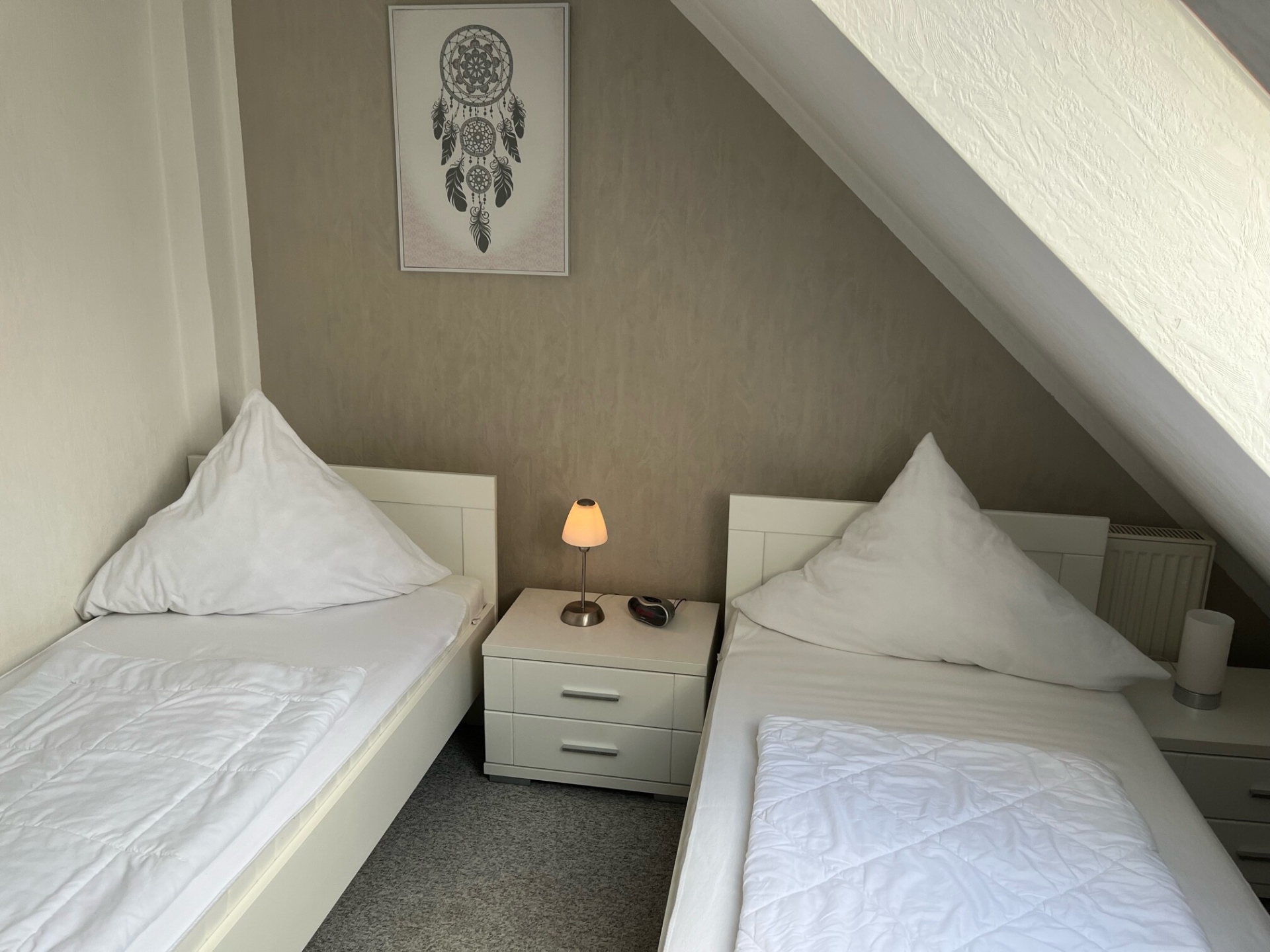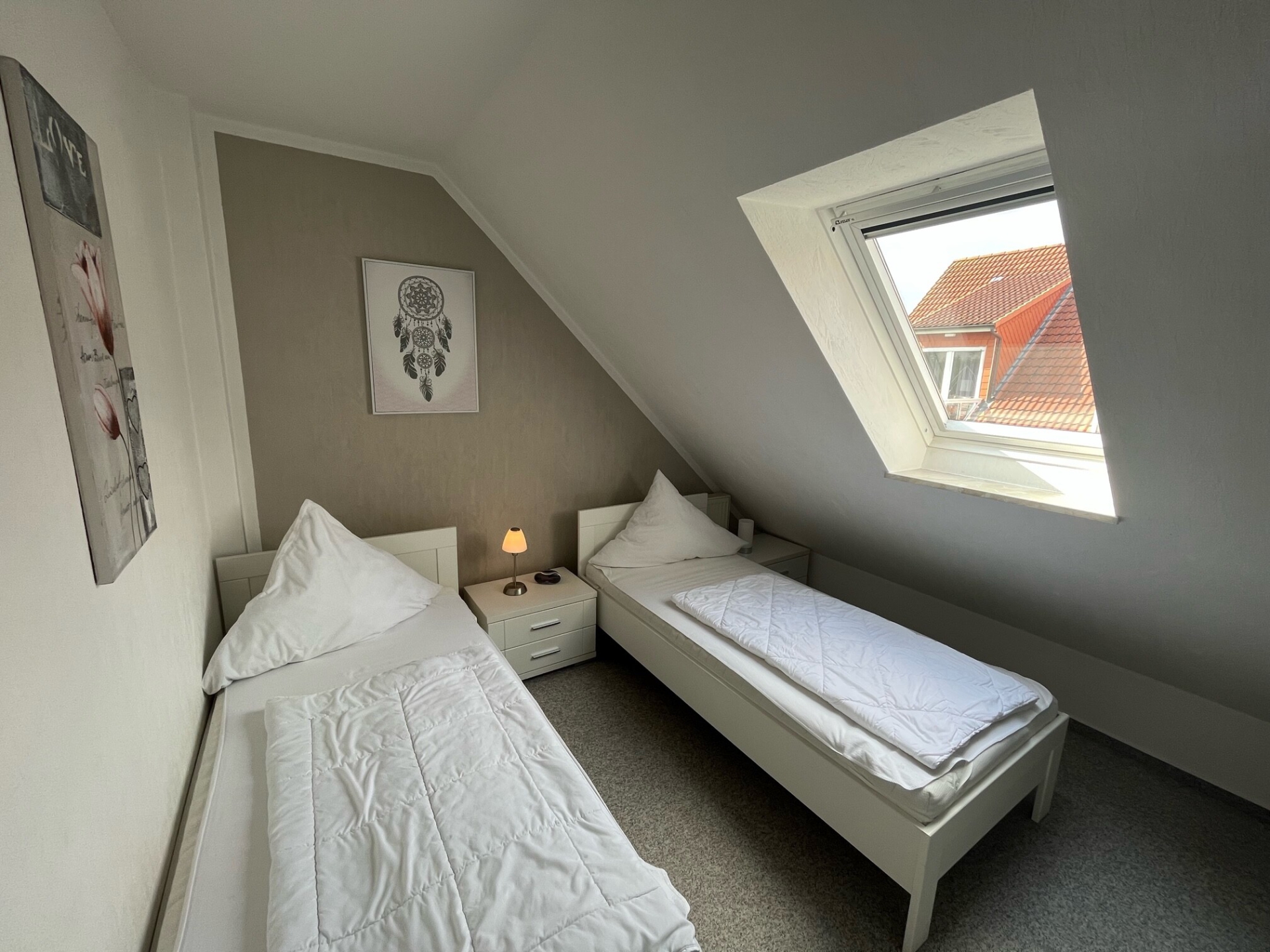 Im kleineren Schlafraum befinden sich 2 Einzelbetten, die auf Wunsch zusammengeschoben werden können. Dieser Raum verfügt über Teppichboden und einen Fernseher.