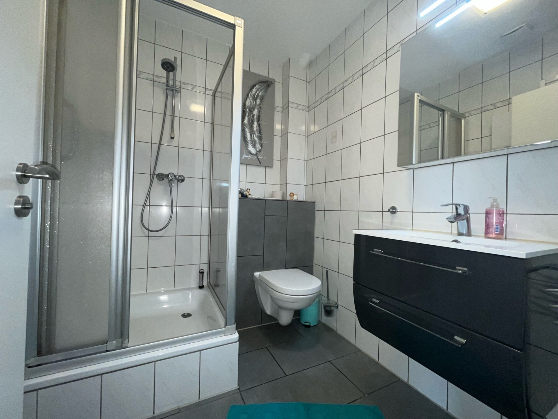 Auch das Bad in modernen Weiß- und Grautönen lässt keine Wünsche offen.