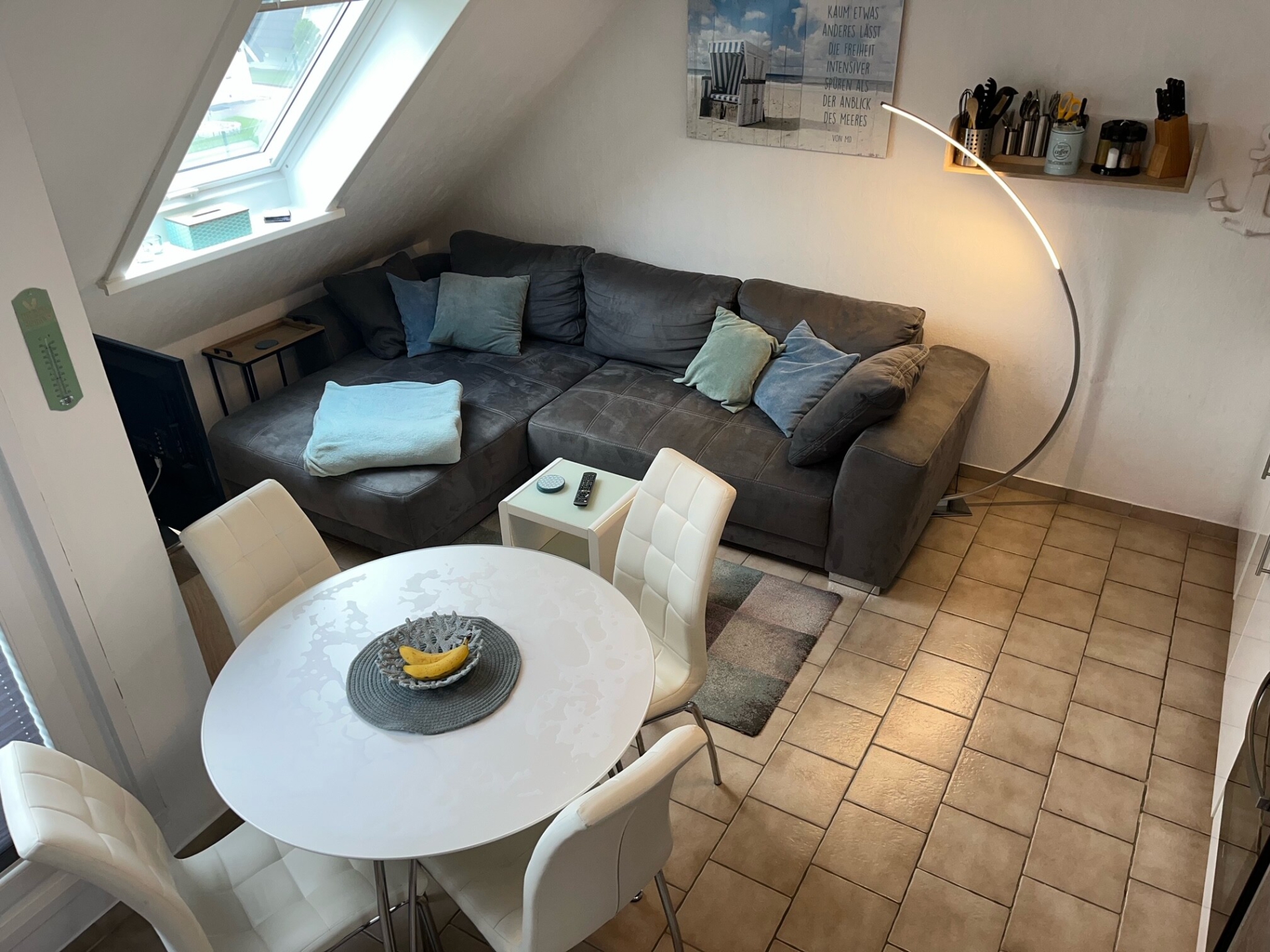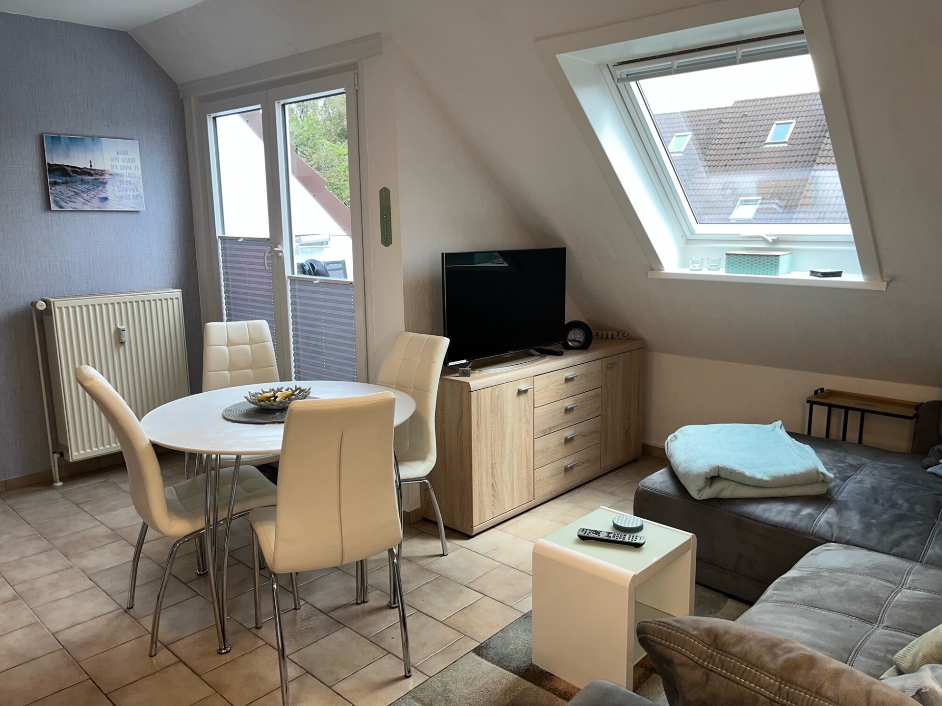 Der Wohnraum bietet ausreichend Sitzmöglichkeiten und lädt zum gemütlichen Spiele- oder Fernsehabend mit Smart-TV auf einer großen Couch mit Doppelottomane ein. Von dort gelangt man auf die geschützte Loggia mit Südausrichtung.